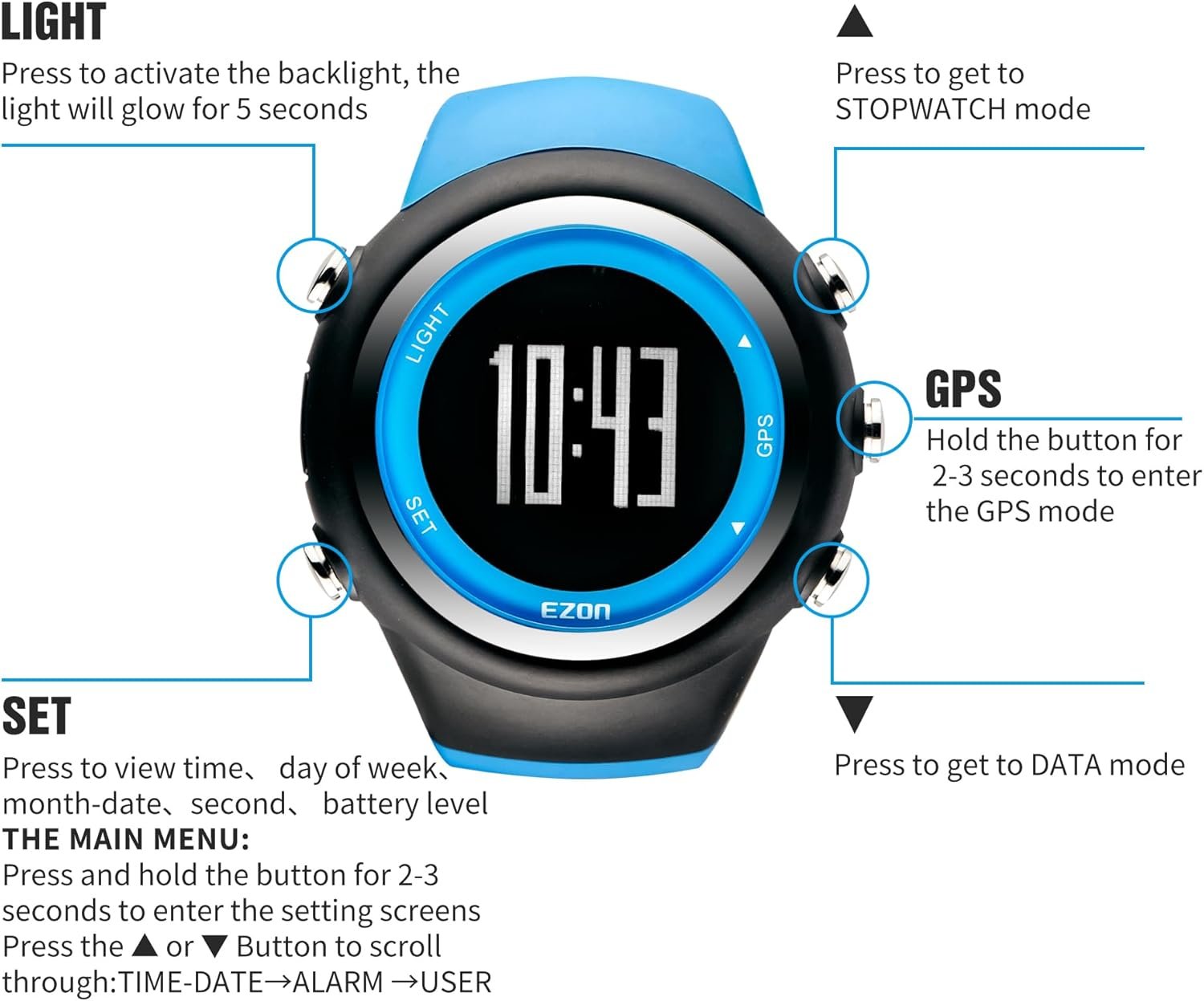EZON GPS Running Watch with Distance Pace Alarm and Calorie Counter and Stopwatch for Men (Blue)
