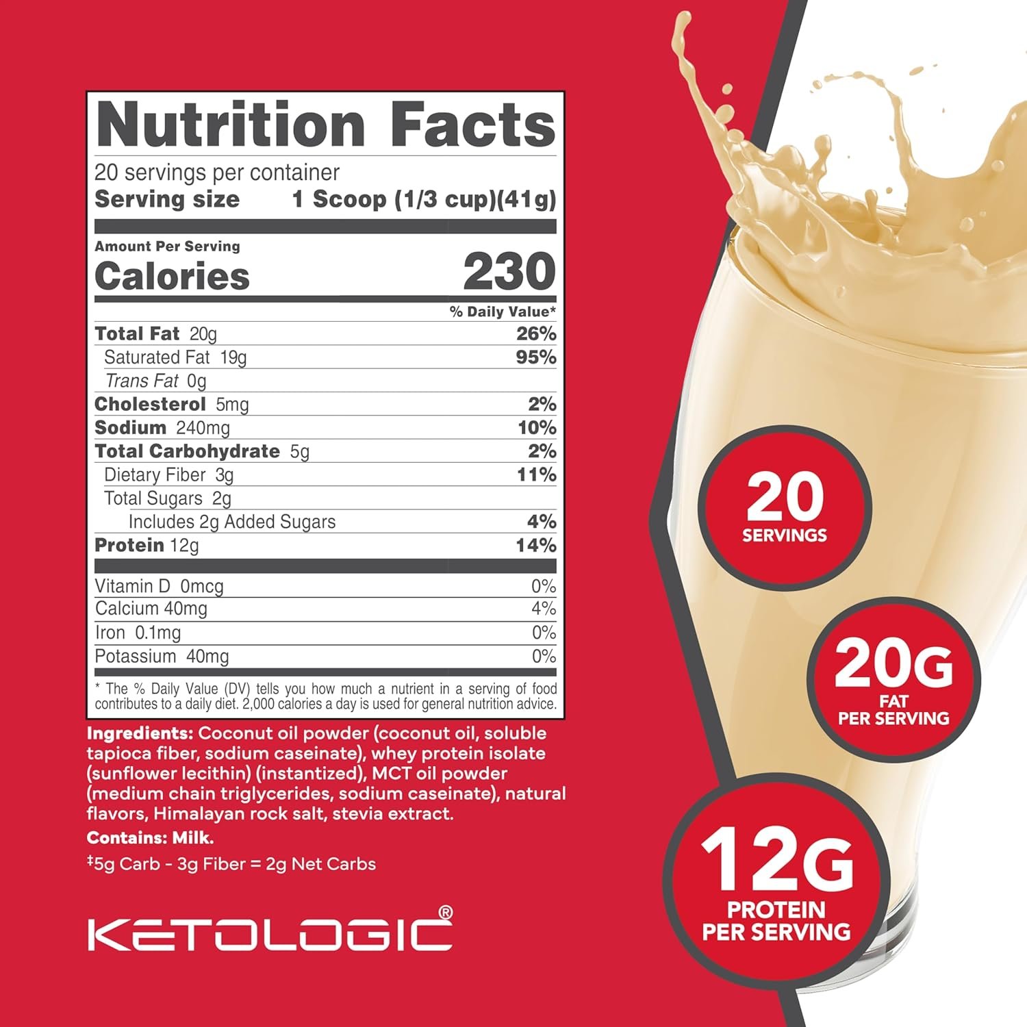 KetoLogic Keto Meal Replacement Shake Powder with MCT Oil and grass-fed whey is expertly formulated for ketogenic and low-carb lifestyles. Delivering the perfect 70:30 fat-to-protein+carb ratio, it fuels your body with only 3g net carbs per serving. This vanilla-flavored shake keeps you full for hours, supports ketosis, and helps manage cravings. Made in the USA with premium, sugar-free, gluten-free, and artificial flavor-free ingredients, it mixes well with water, milk, or almond milk. Each 2 lb container provides 20 satisfying servings, ideal for busy individuals seeking convenient, nutritious, and delicious keto-friendly meal replacements. Perfect for energy, satiety, and optimal keto results.