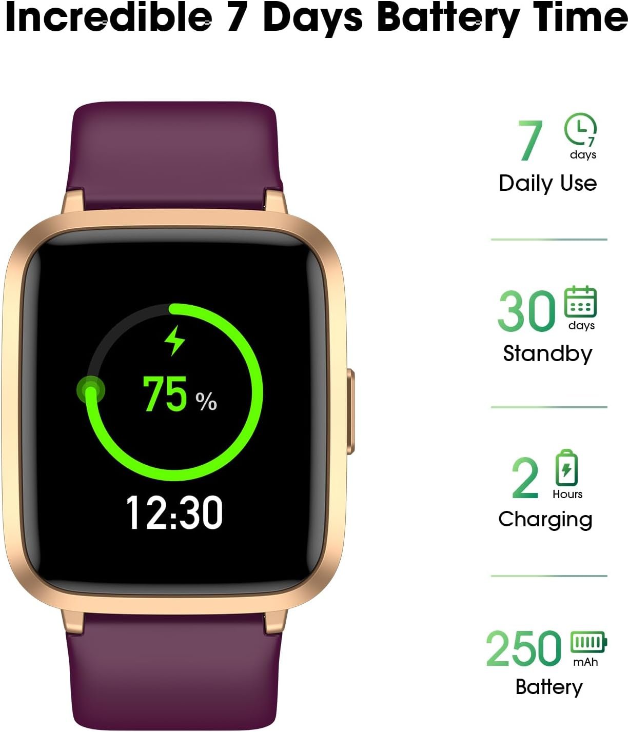 Long Battery Life and IP68 Waterproof: This smart watch only requires 2 hours of charging and can be used for 5-7 days continuously, IP68 waterproof rating can withstand daily sweat, washing hands and rainy day, allowing you to fully enjoy your workouts.