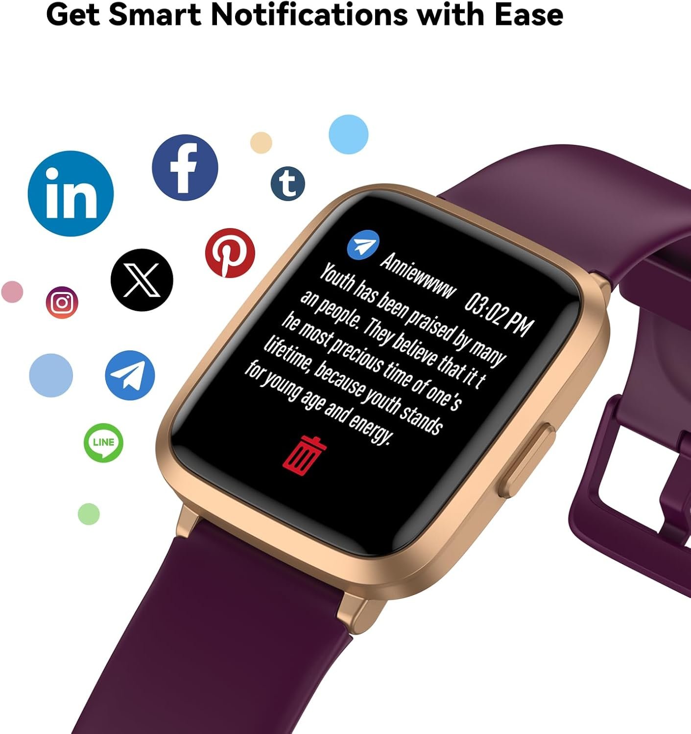 Notifications reminders ensure that you will not miss any important things while you are busy. Please note: the smart watch can not make calls or text.