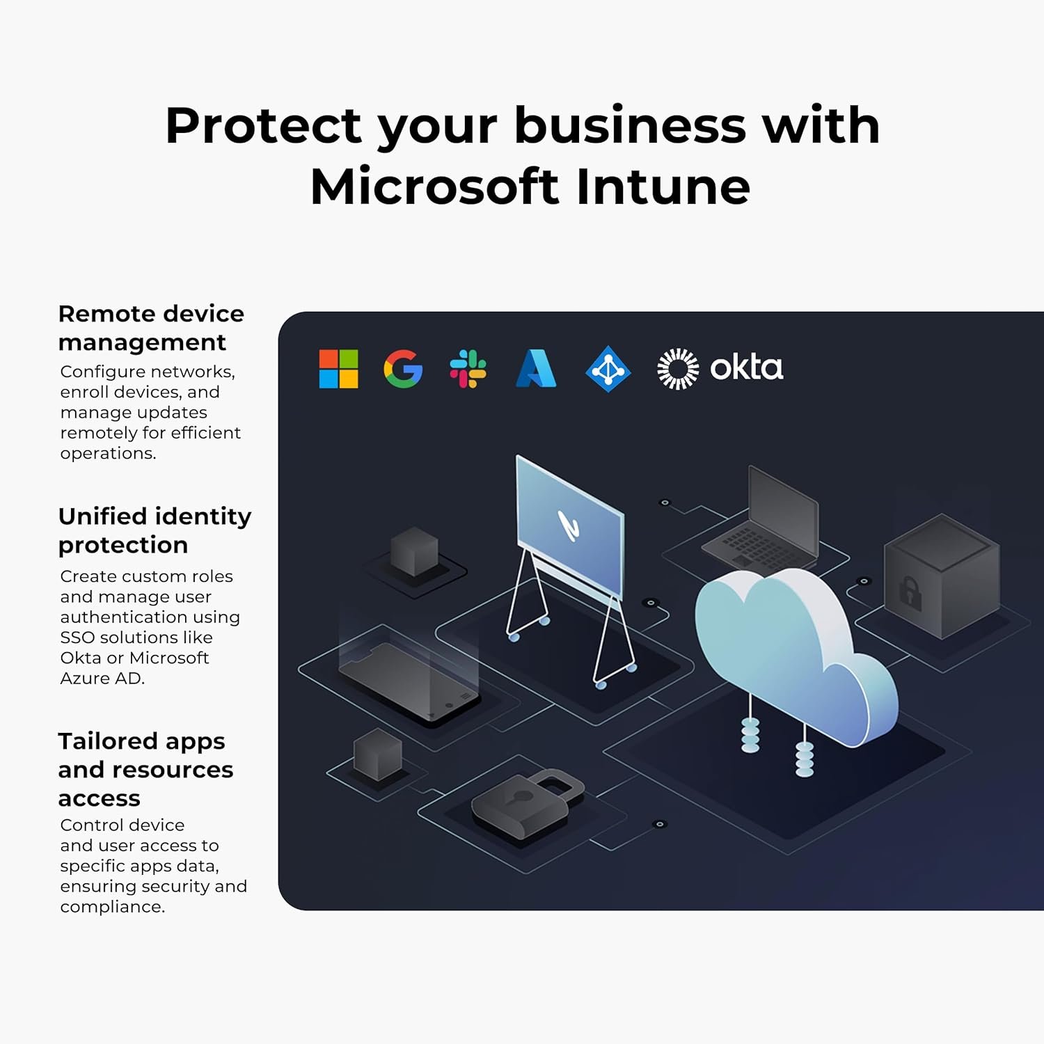 Enterprise Security & Centralized IT Management withMicrosoft Intune :Protect your organization with remote configuration, device enrollment and update management via MicrosoftIntune. Support SSO solutions such as MicrosoftAzure AD and Okta, enabling granular control over user access, apps and data—ensuring compliance, security and scalable deployment across offices, classrooms and conference rooms.