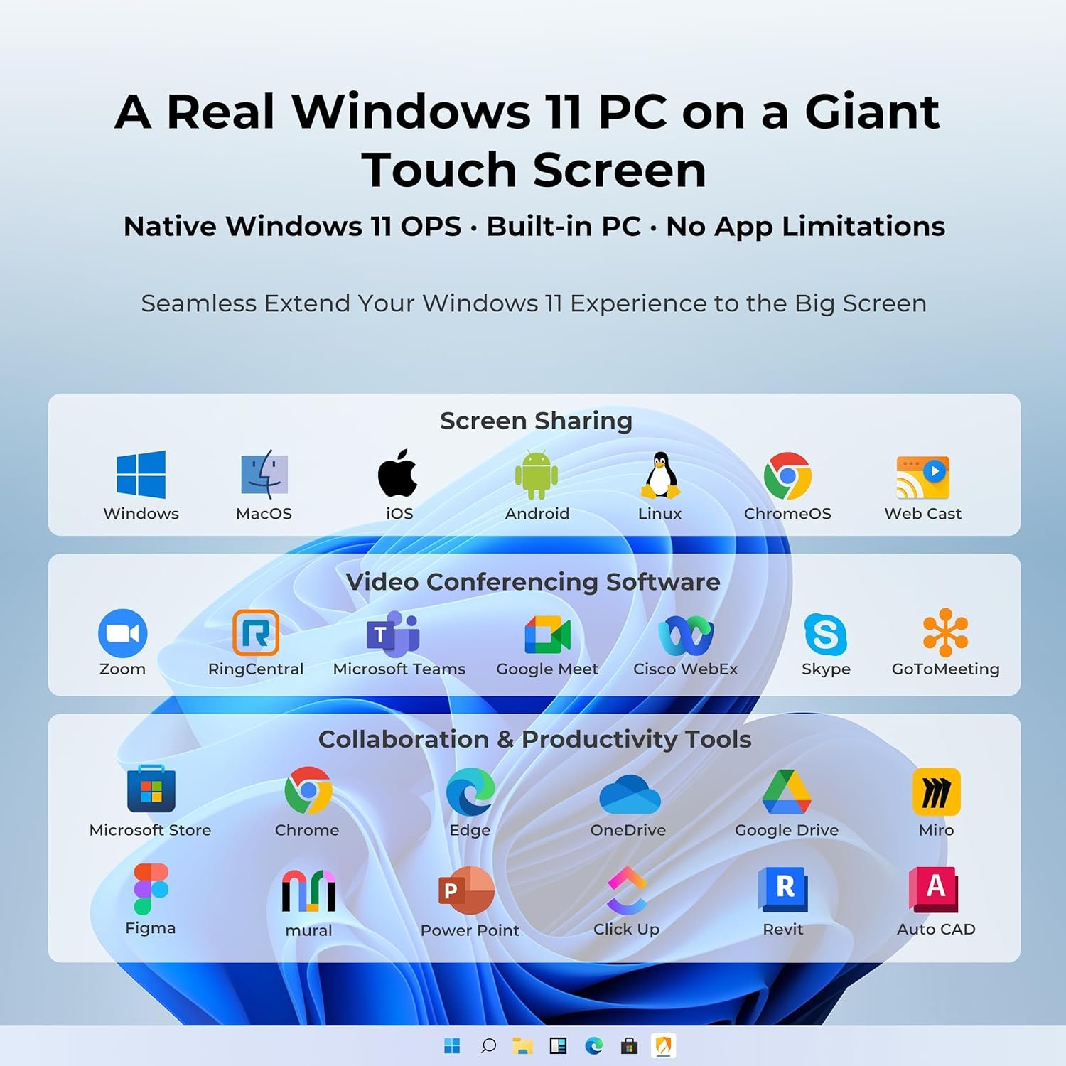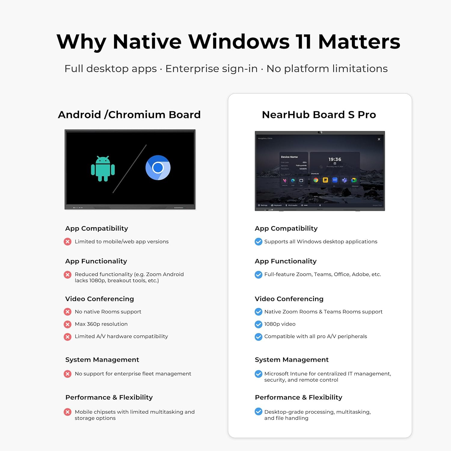 Native Windows 11 OPS – No App Limitations:Powered by Windows 11 with a built-in OPS PC (12th Gen Intel Core i5, 16GB RAM + 128GB storage), NearHub Smart Whiteboards run full desktop applications without compromise. Seamlessly support MicrosoftOffice, Teams, Zoom, AutoCAD, professional audio/video peripherals and third-party enterprise software—delivering a smoother, smarter experience than Android or Chromium-based whiteboards.(Board+Wall-mounted bracket)