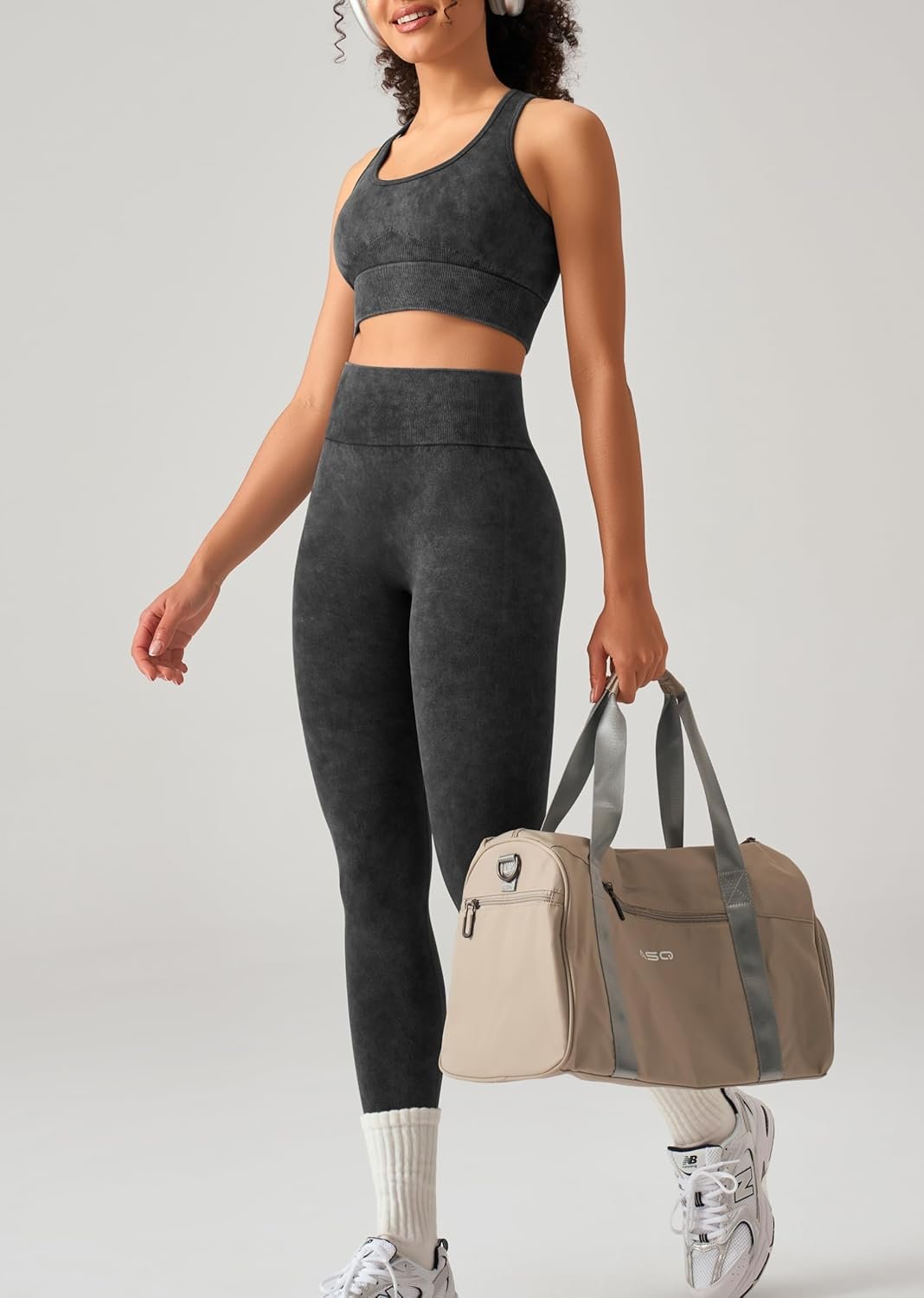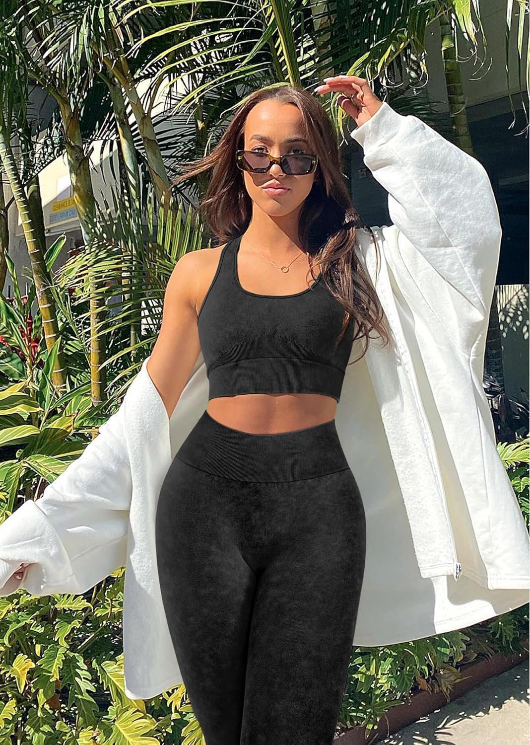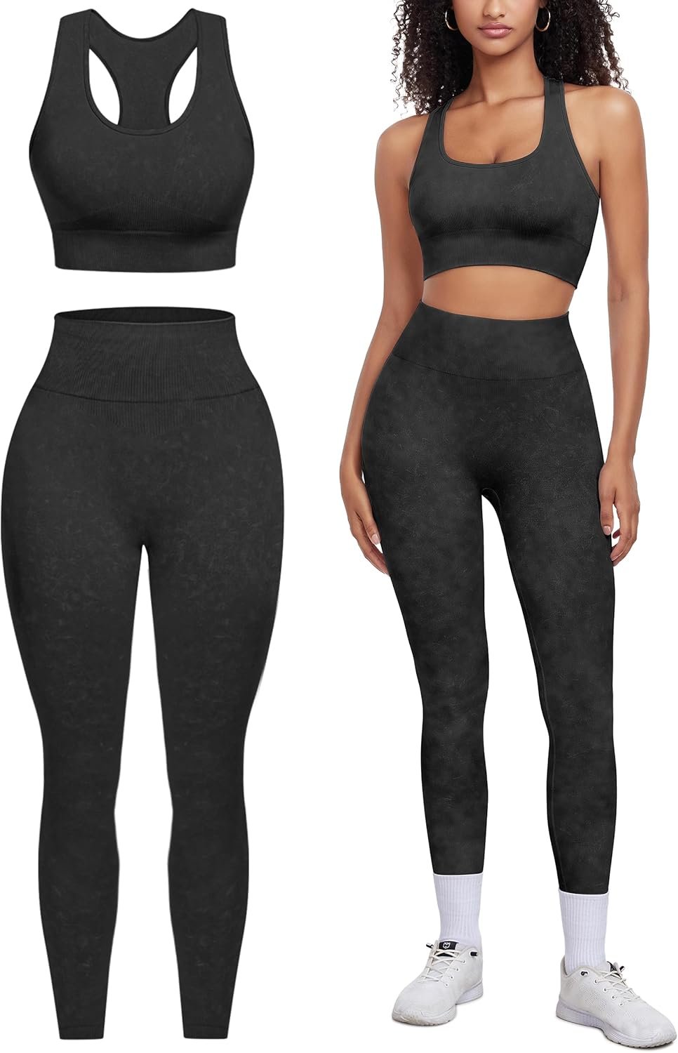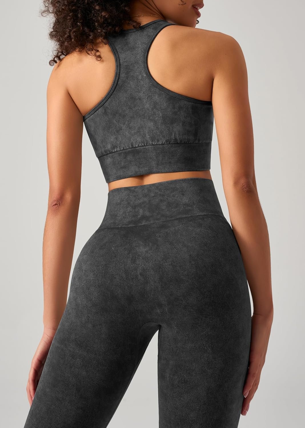 OLCHEE Womens Workout Sets 2 Piece – Acid Wash Seamless Yoga Outfits High Waist Leggings Padded Racerback Sports Bra Gym Set