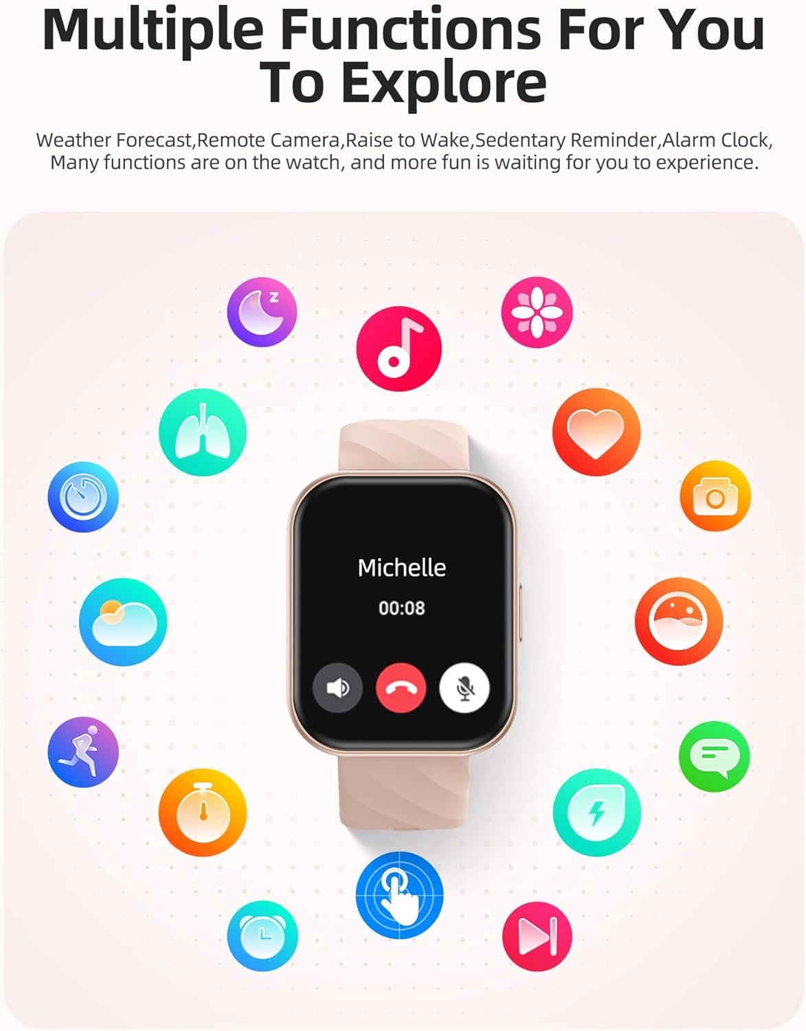 【DISCOVER MORE EXCITING FEATURES】This smart activity tracking watch not only records your daily movements but also offers a range of practical features: all-day activity tracking, breathing exercises, female health monitoring, weather updates, music control, stopwatch, alarm, timer, camera control, brightness adjustment, sedentary reminders, phone finder, wrist-raise wake-up, and more. It’s your personal health and lifestyle assistant, always by your side, helping you manage your life and wellness, keeping you energized and active every single day!