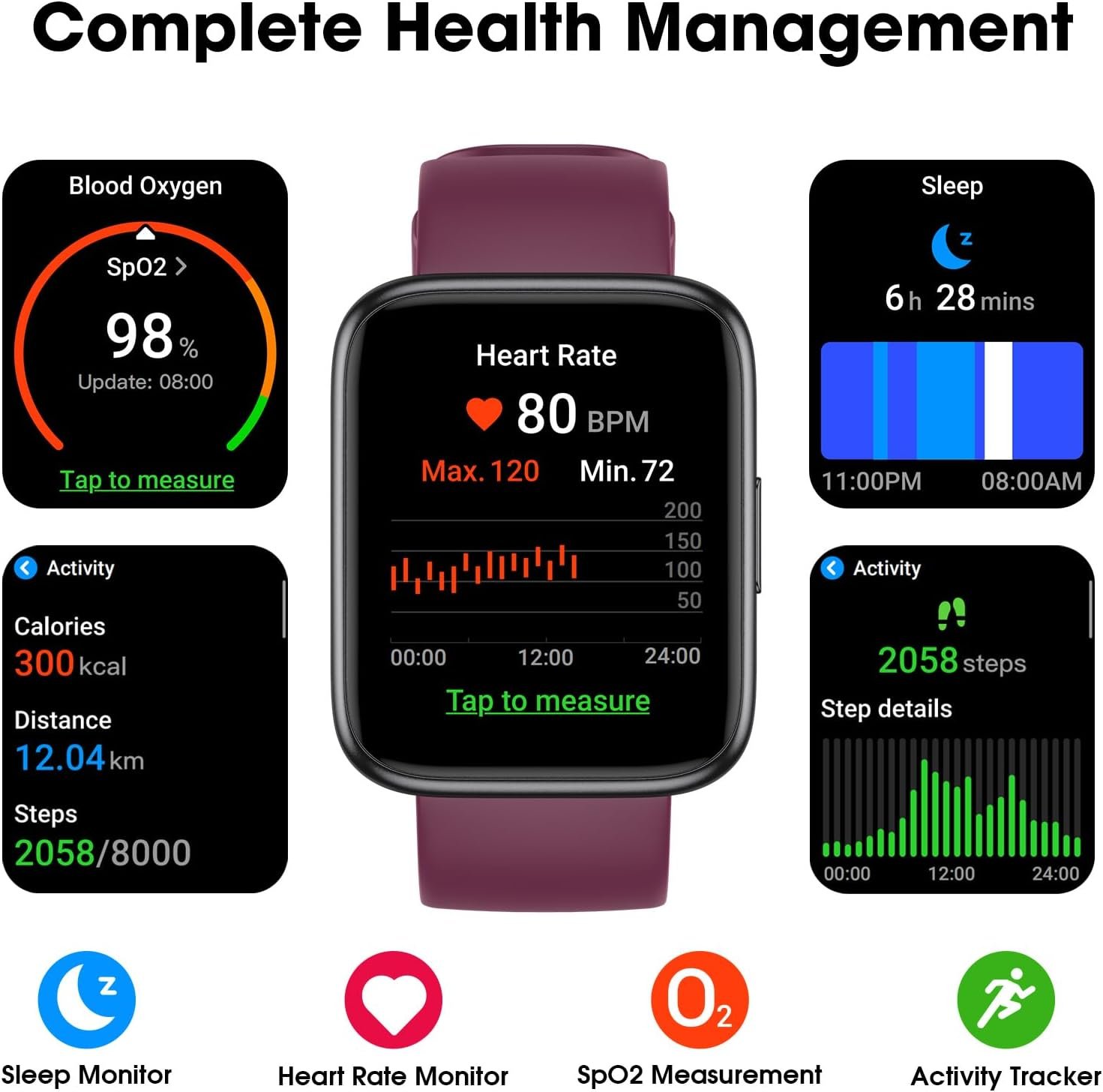 【Complete Health Management with Just This Smart Watch】This smartwatch can comprehensively measure your heart rate and blood oxygen levels; Additionally, it tracks your sleep patterns, including deep sleep, light sleep, and REM sleep.