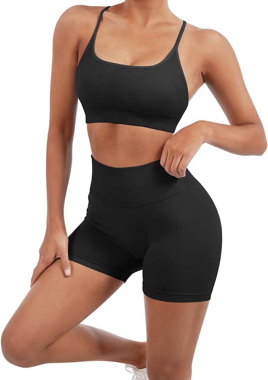 SUUKSESS Women Seamless Workout Sets Strappy Sports Bra High Waist Booty Shorts Outfits
