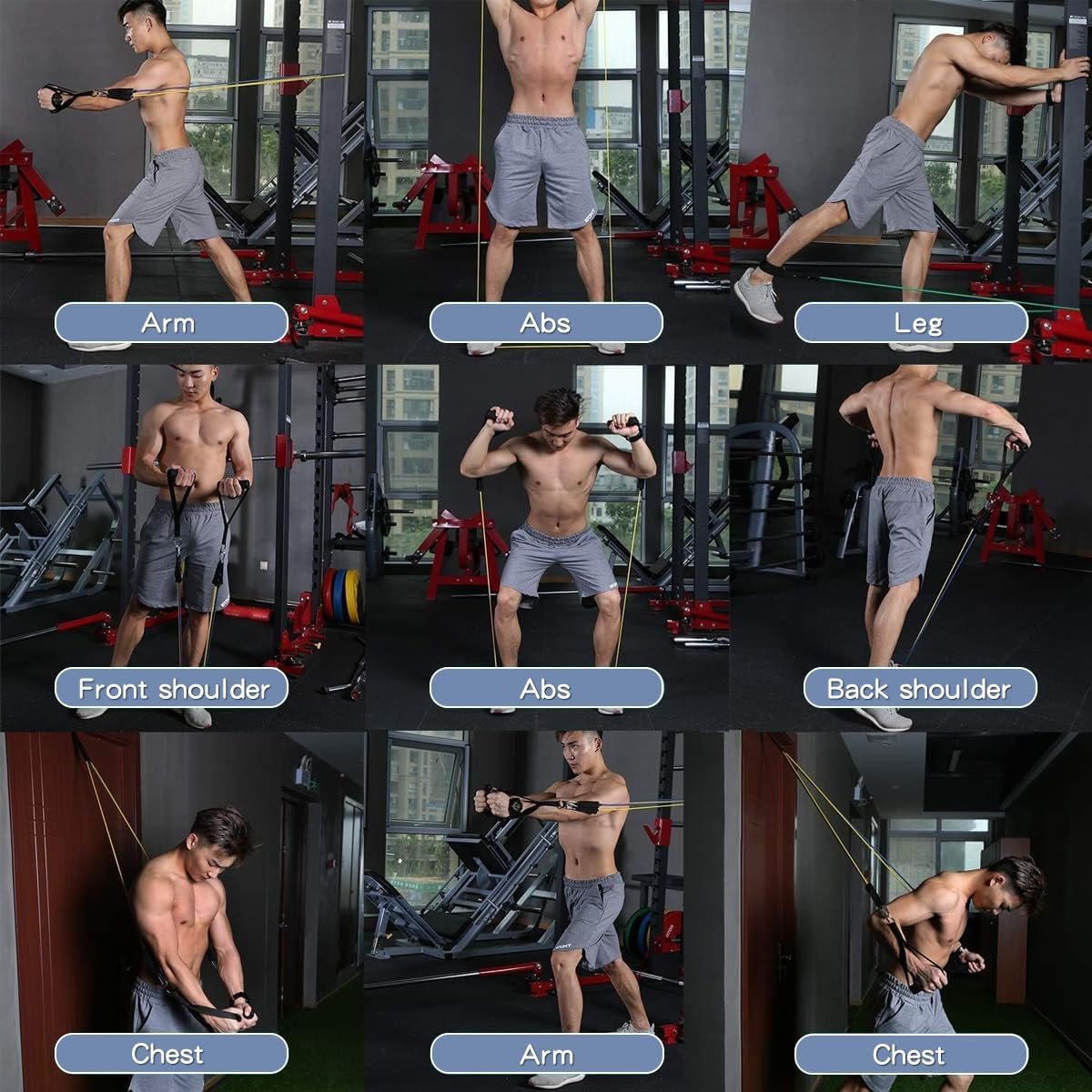 DIFFERENT COLOR ADJUSTABLE RESISTANCE BANDS: The exercise bands come with 5 different resistance level 10lbs, 20lbs, 30lbs, 40lbs and 50lbs in 5 different colors, and and can be used alone stacked in any combination to a maximum equivalent of 150 lbs